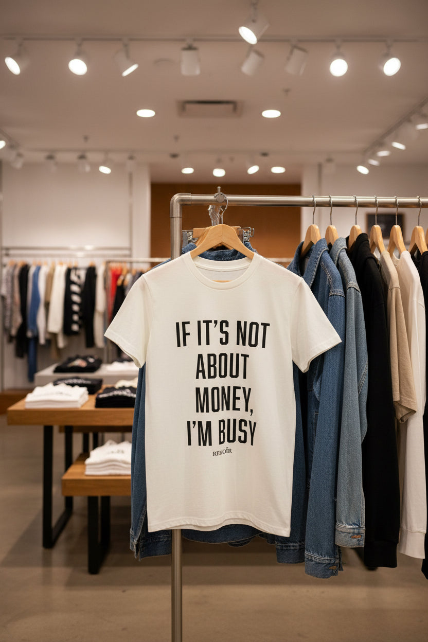 Crafted from heavyweight 100% combed cotton, The Agenda Tee delivers the unmistakable structure and drape of true luxury streetwear. Centered across the chest, the statement “IF IT’S NOT ABOUT MONEY, I’M BUSY” is rendered in bold gothic lettering, finished with subtle REMOIR branding for a mark of authenticity. Designed for those who value time, power, and precision, this piece merges refined minimalism with unapologetic confidence. Cut in a boxy silhouette with a thick ribbed collar, it’s made to hold its shape — and your standards — wear after wear.